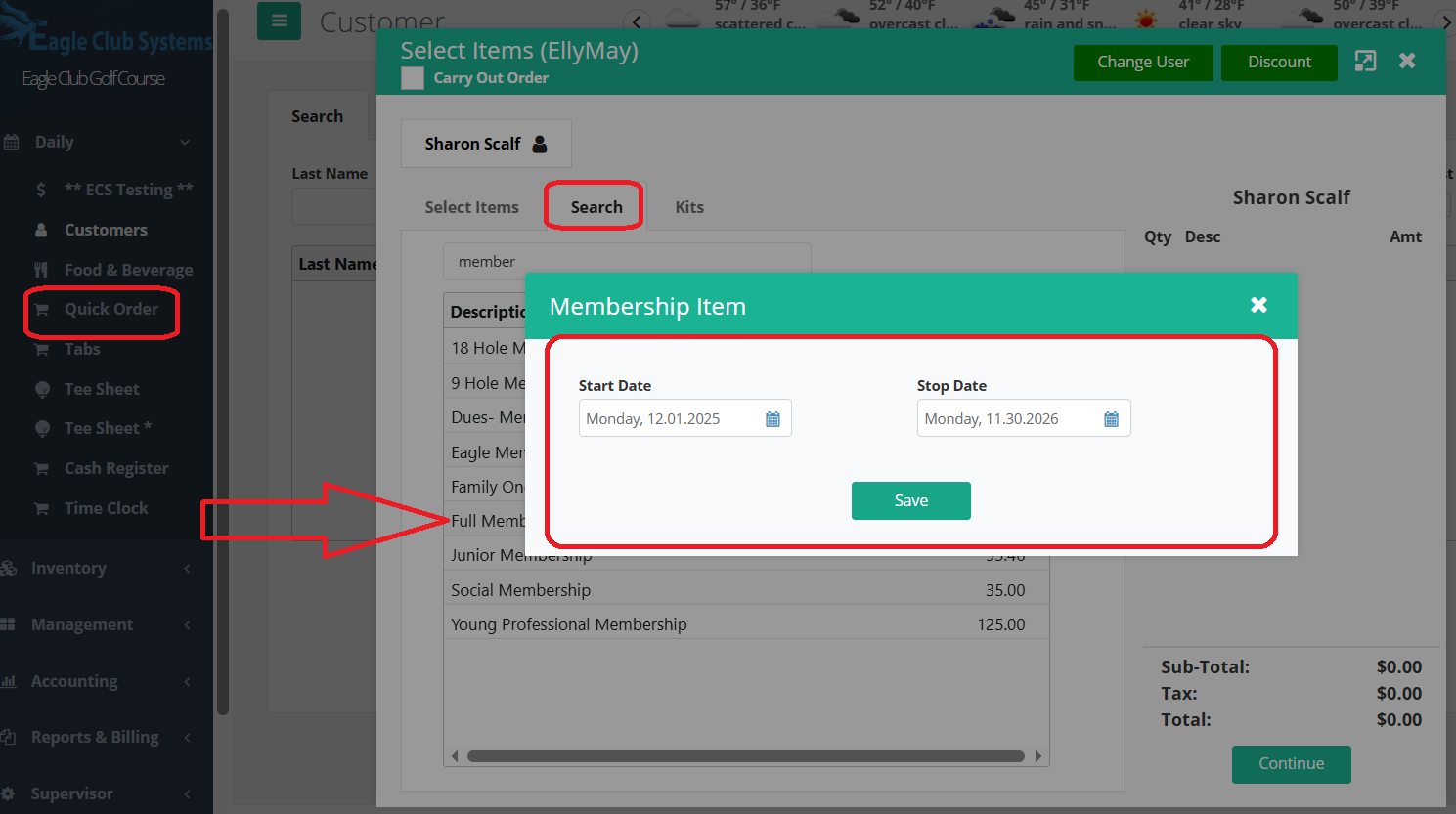 Go to quick order. Pull up the customer. Find the Membership you wish, either by searching for the item or clicking on a Memberships button.