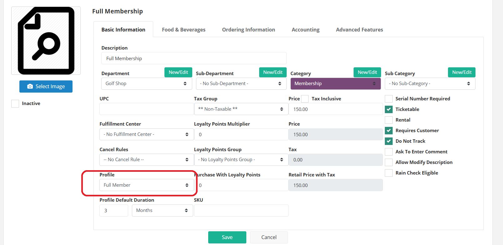 Make sure your Membership Inventory Item is setup with the Profile in the bottom left chosen. This enables the start and expiration date boxes to activate. The profile is then tied to your Tee Sheet and Online Booking through your Green Fees, under Management, Tee Sheet, Green Fees.